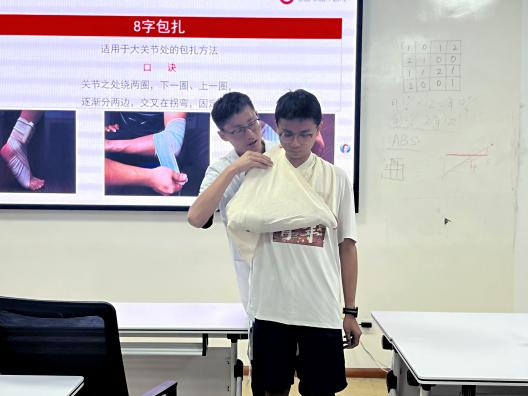 接著,姚云騫老師分享了關(guān)于“創(chuàng)傷救護(hù)”的急救知識(shí)。他普及一個(gè)“先救命,后治傷”的救護(hù)原則,并現(xiàn)場(chǎng)演示了直接壓迫止血,加壓包扎止血,8字包扎法,三角巾膝關(guān)節(jié)帶式包扎,骨折固定等救護(hù)方法。